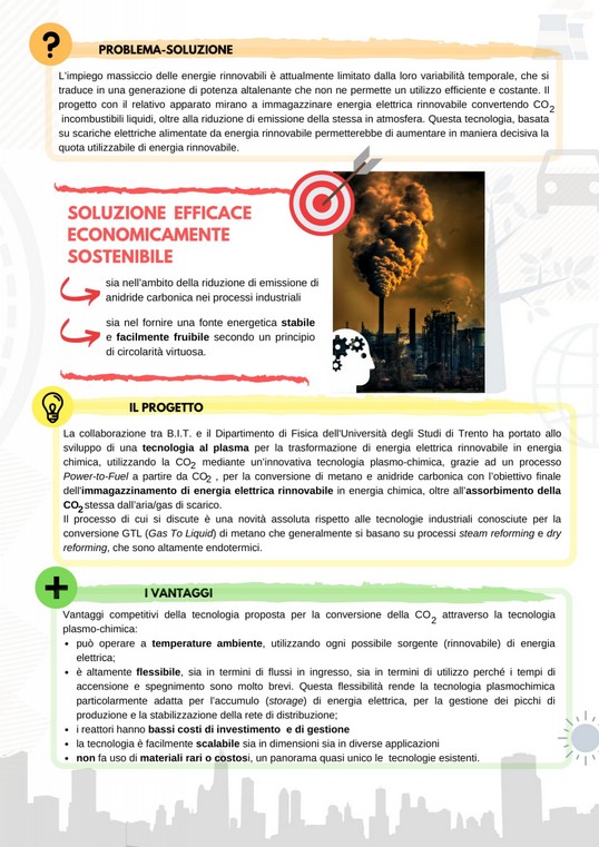 Metodo ed apparato per il trattamento di gas in corso di rilascio di brevetto (ad es. per la cattura e la scomposizione della CO2 derivante dalla combustione di idrocarburi o da processi industriali in genere al fine di riutilizzarla per ottenere dei prodotti ad alto valore aggiunto, come ad esempio carburanti gassosi o liquidi). La ricerca è stata sviluppata assieme al Dipartimento di Fisica dell’Università degli Studi di Trento a seguito di un accordo sottoscritto in data 27 giugno 2016.